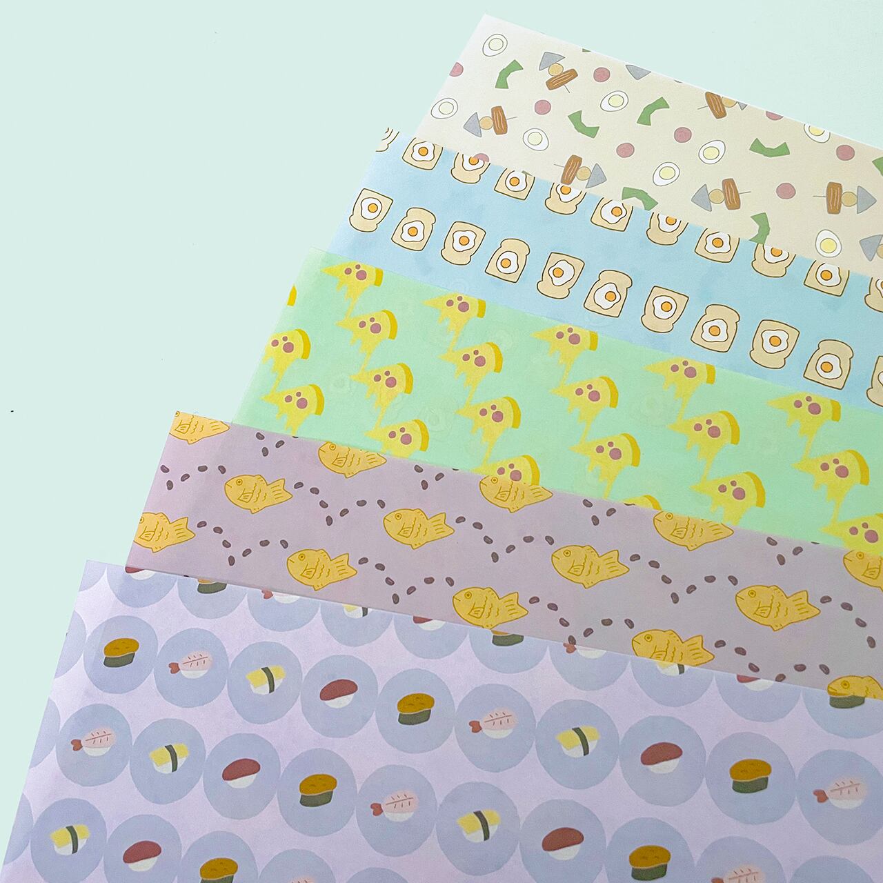 食べものは人気のモチーフですが、amiiのデザインペーパーに登場するのはだし巻き卵やおでん、ラーメンやお寿司など、