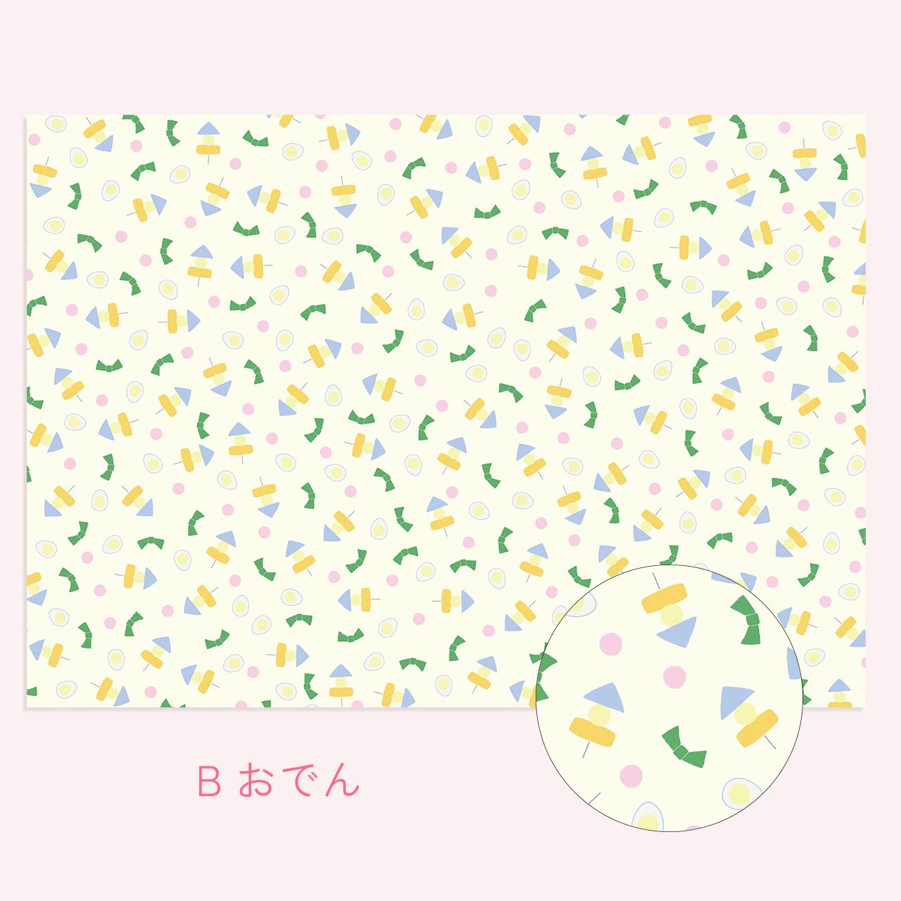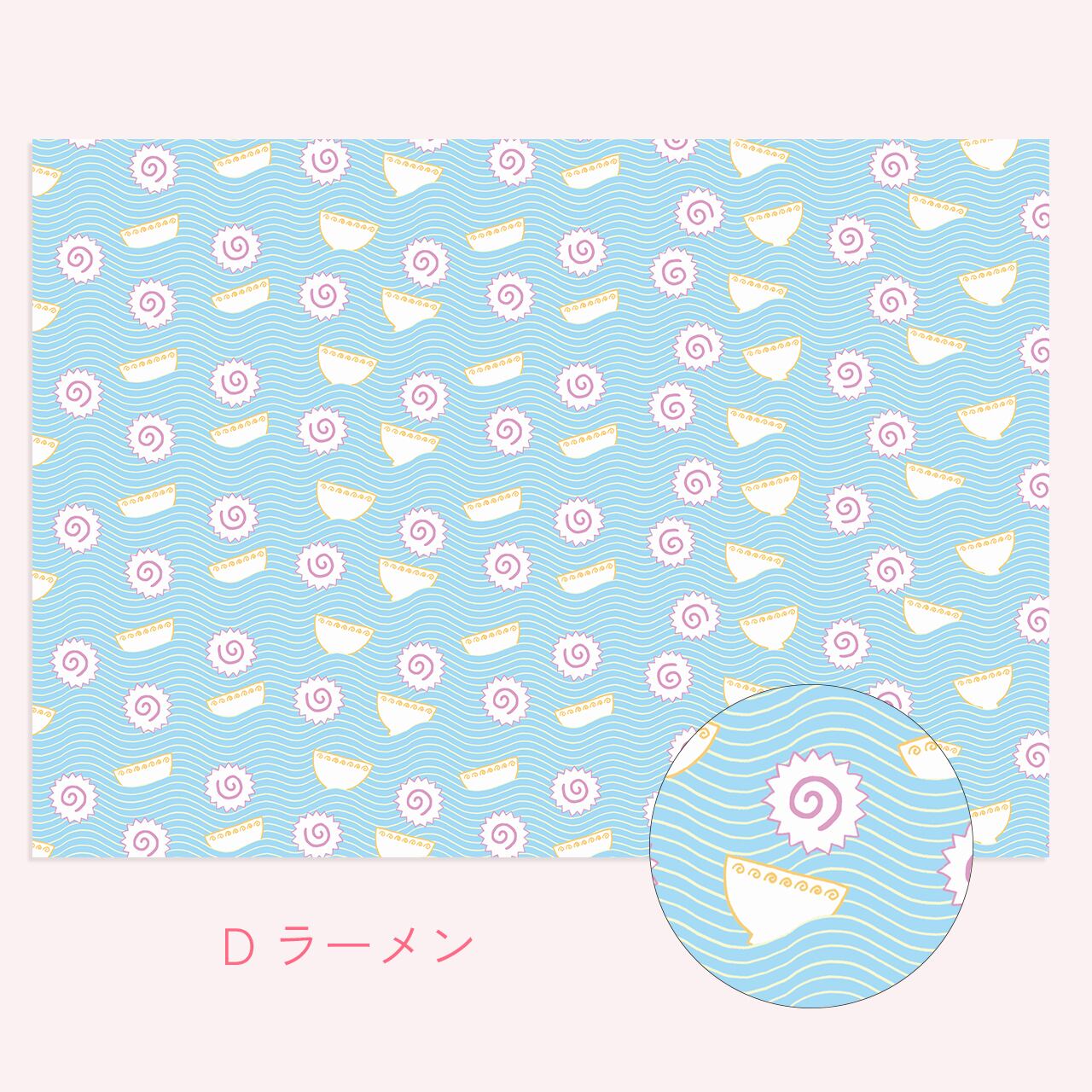 だし巻き卵やおでん、ラーメン、お寿司など、おなじみの食べ物がにぎやかな柄になって登場します。