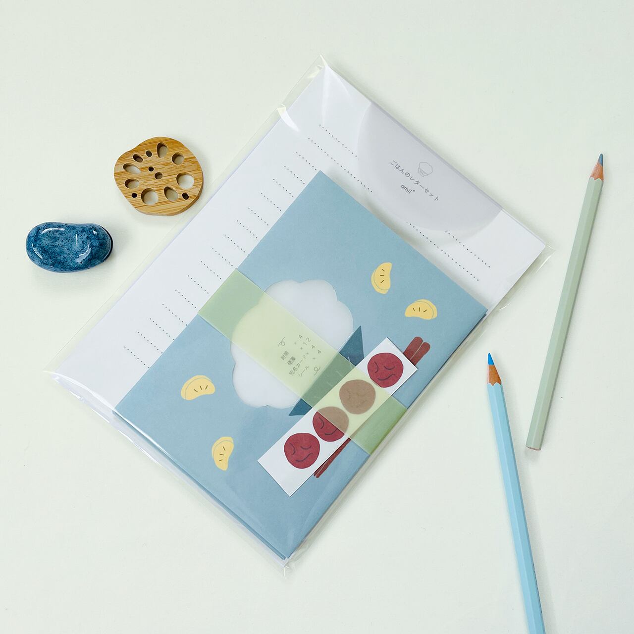 封筒にはごはんとたくあん、便箋は食後のお茶、封をするシールは梅干し。