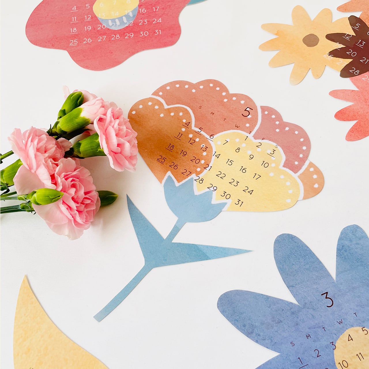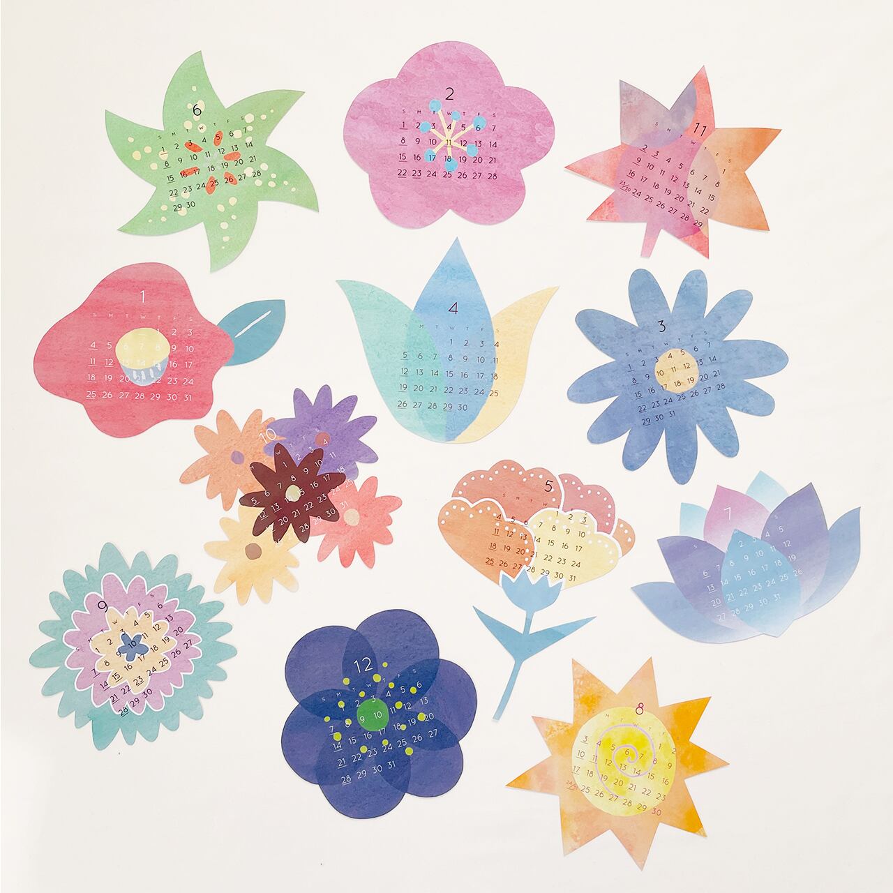 お花のかたちをひとつひとつ切り抜いて、カレンダーをつくりました。